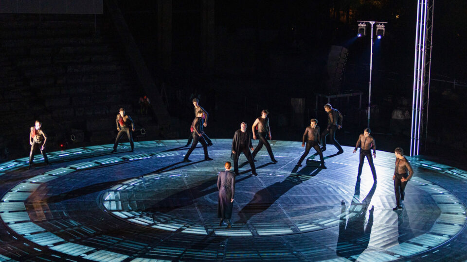 Η έναρξη ήταν εντυπωσιακή, με μια μεγάλη παύση και τον Χορό να σέρνεται πάνω στον δίσκο, μέχρις ότου ανακτήσει τον βηματισμό του. Δύο πολύ ψηλοί στύλοι που φωτίζονται με νέον –το μοναδικό σκηνικό– συμβάλλουν στην εικαστικότητα της στιγμής. Στις δυόμισι ώρες που κράτησε η παράσταση, λίγες ήταν οι σκηνές που ανέβασαν τους παλμούς των θεατών, κυκλώνοντας με την ατμόσφαιρά τους. Βοήθησαν σε αυτό ορισμένα καλά δουλεμένα χορικά και η επιτάχυνση –και του μουσικού– ήχου. Λίγες στιγμές «συναντήθηκαν» σώμα, χώρος και ρυθμός.